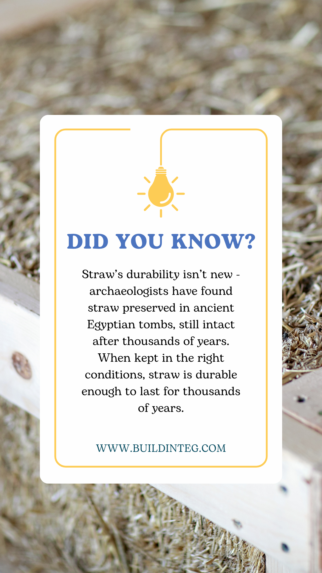 If straw is baled dry and kept below 20% moisture by weight, it will not mold or rot — in fact, dry straw has been preserved for centuries, even found intact in Egyptian tombs. Prefabricated straw panels are installed quickly and protected with a water-resistive barrier, minimizing exposure to rain during construction. Of course, no building material is totally rot-proof — good design and detailing are key for every structure.
