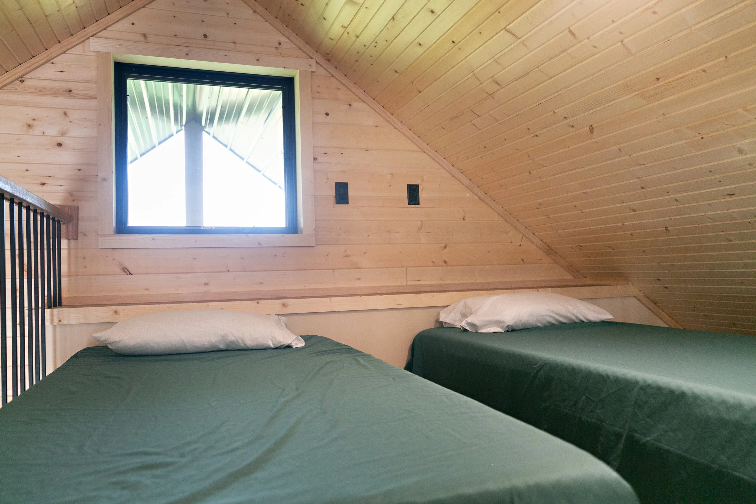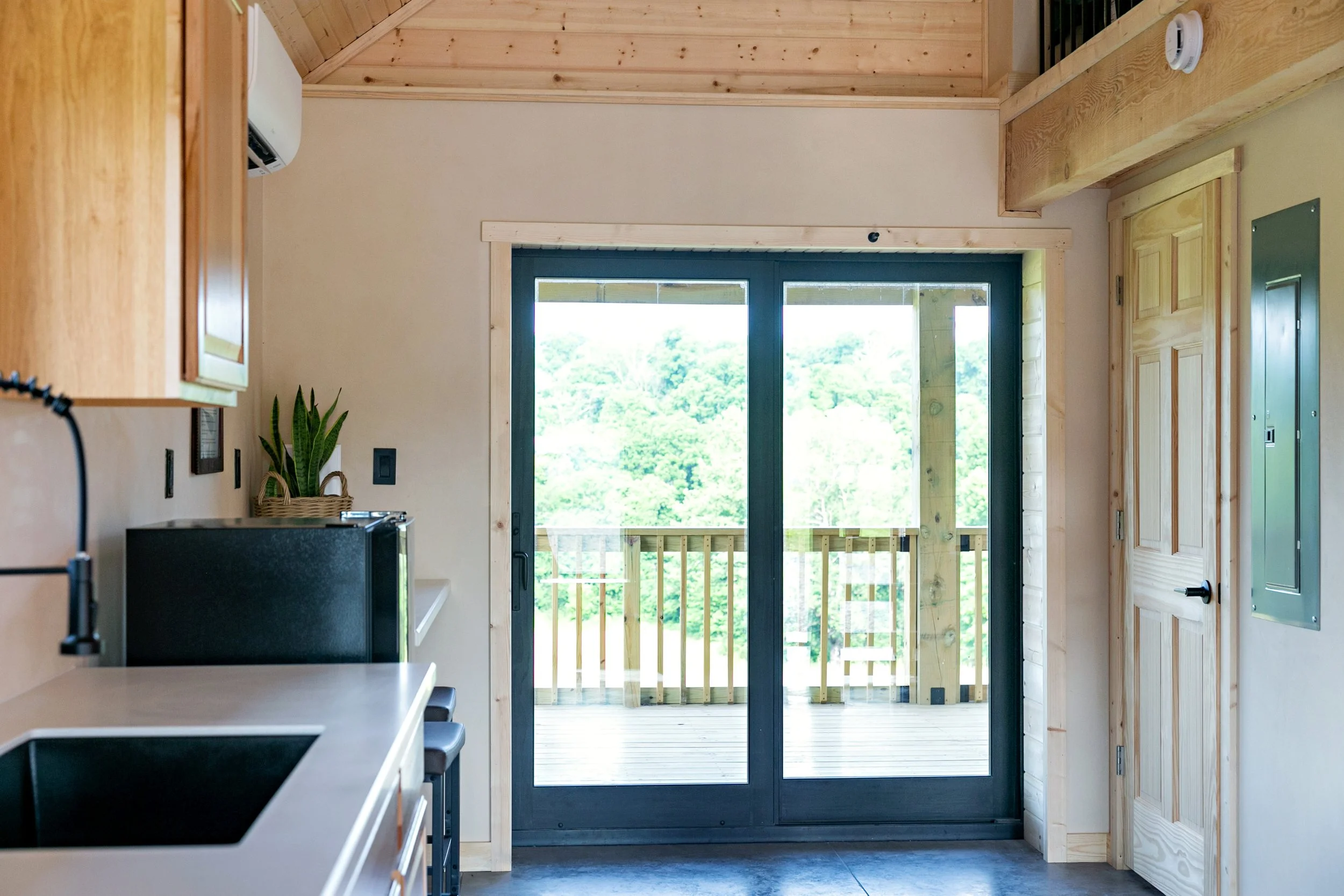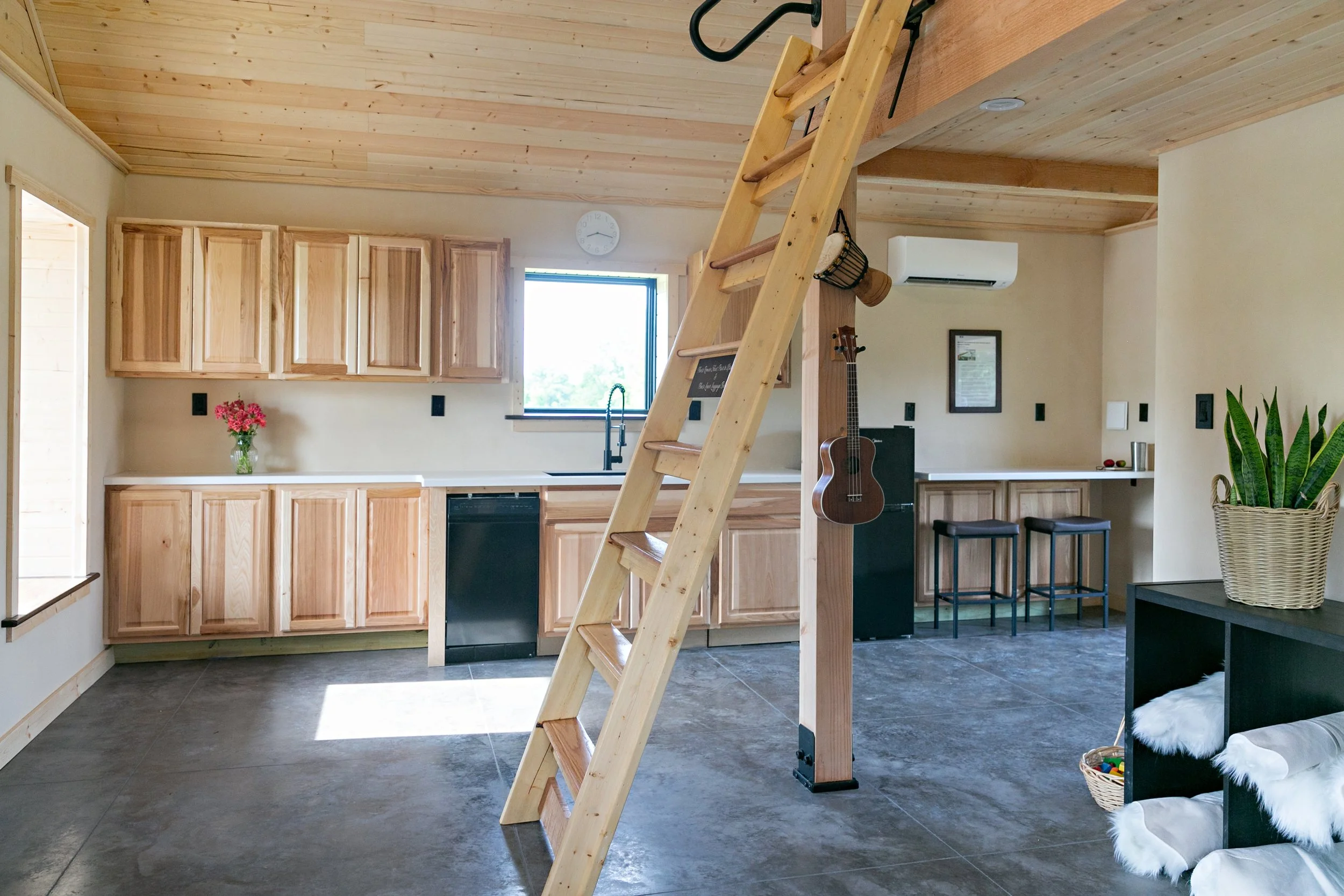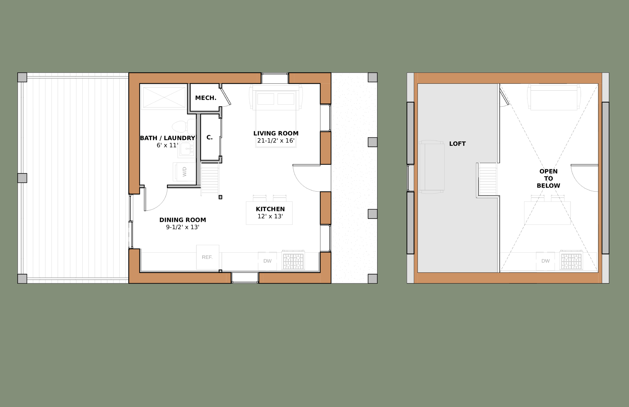 The steep roof of “The Joan” allows an upstairs loft making it a perfect family cabin or ADU. The main floor is set up to flexibly serve as living or sleeping space. A large covered porch off the back can be screened-in to extend living space into the outdoors seasonally. A smaller hipped-roof porch on the front creates a generous covered entry. This design could work well with a slab or crawlspace. The front windows are positioned with ~18” sills - perfect for a little extra seating!